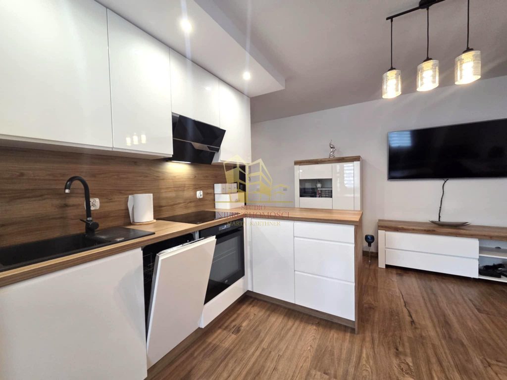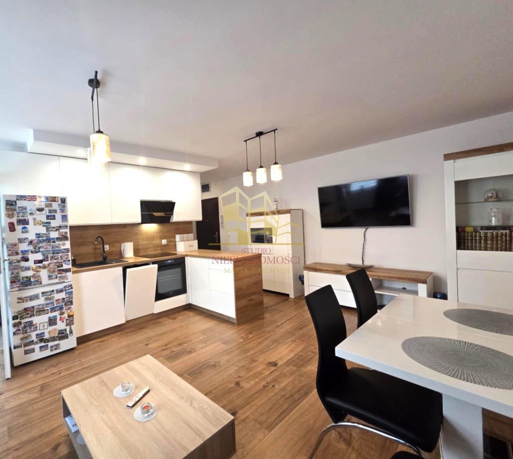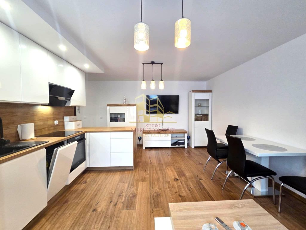 - Nowoczesne meble kuchenne z pełnym AGD (okap, zmywarka, lodówka, płyta indukcyjna, piekarnik, pralka)